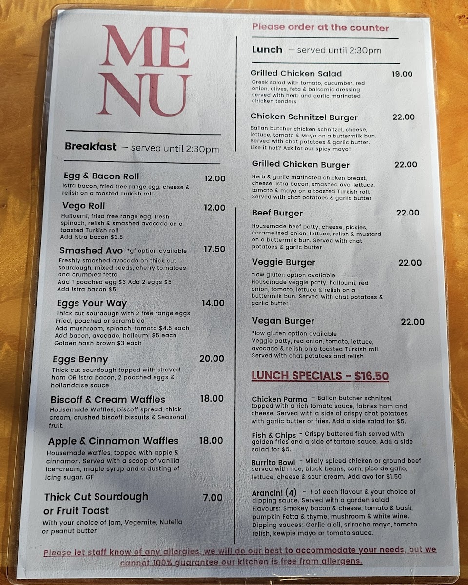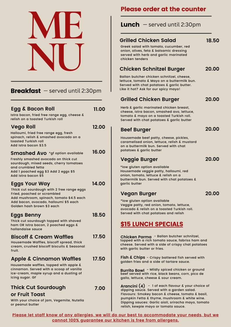 Beverage options include a selection of coffees such as cappuccino and chai latte, alongside other hot drinks to complement the food offerings. The menu is well suited for casual dining experiences, whether for a full meal or a coffee break with light snacks.