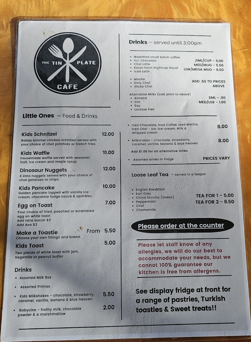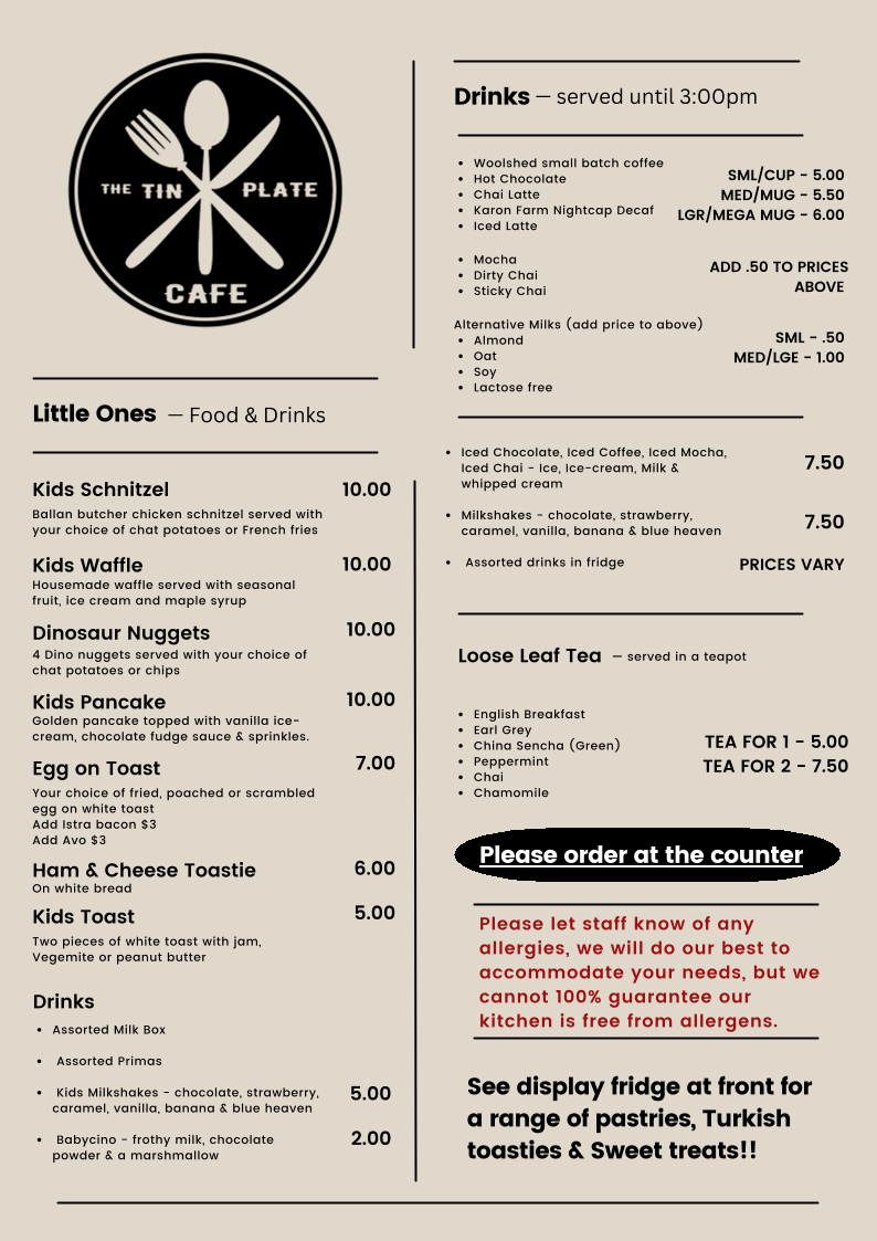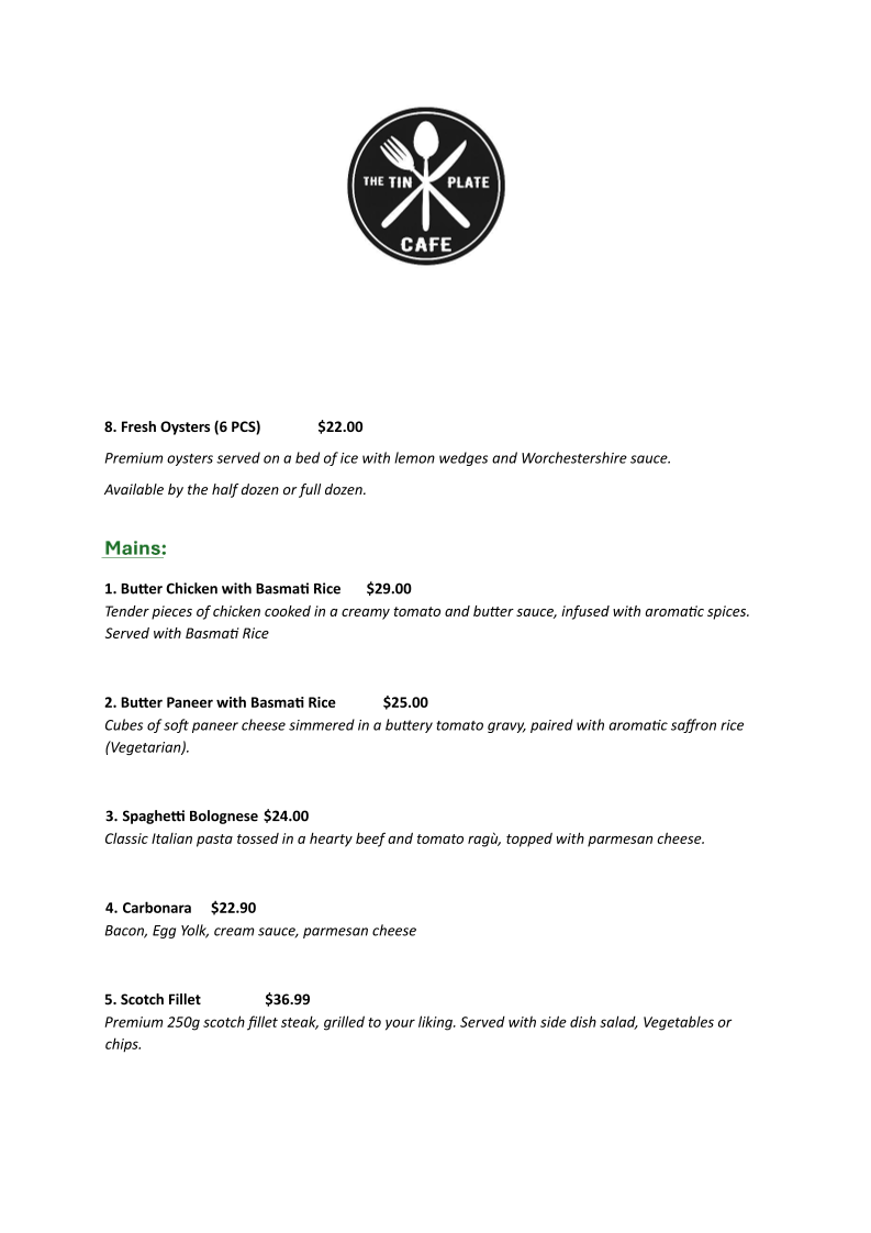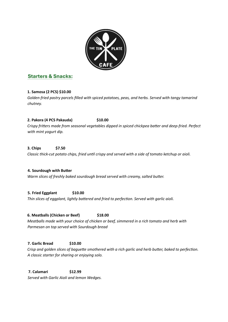 The Tin Plate Cafe Menu