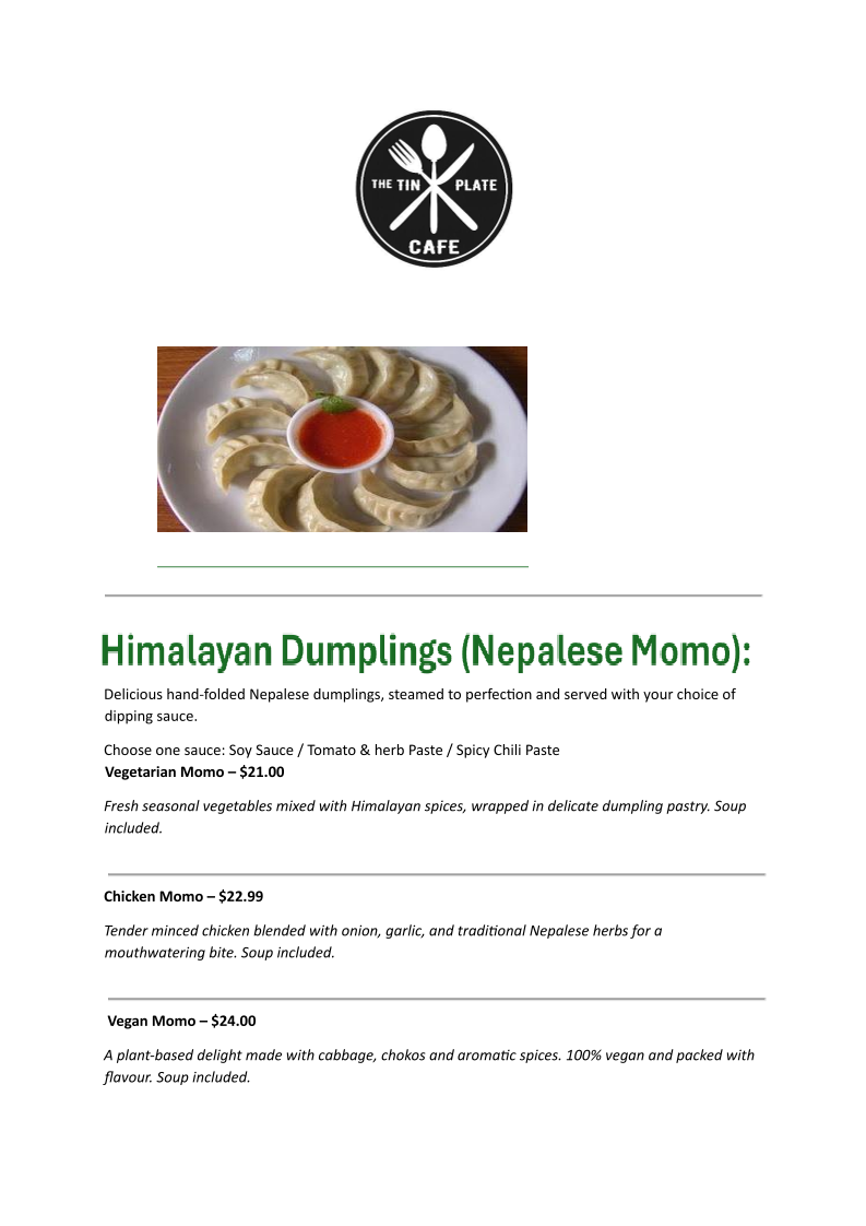 The menu at The Tin Plate Cafe offers a diverse selection of food and beverages suitable for breakfast, brunch, and light meals throughout the day. The menu is structured into distinct sections to cater to different dining preferences, including starters and snacks, mains, and Himalayan dumplings (momo). Additionally, a range of coffee and specialty drinks is available, reflecting the cafe’s dual role as a coffee shop and breakfast restaurant.